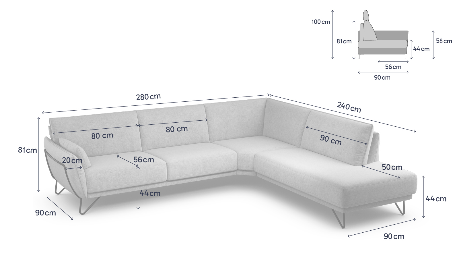 - Sitzbreite: Überstand 50 cm – Sitz 90 cm – Ecke 100 cm – 80 cm – 80 cm