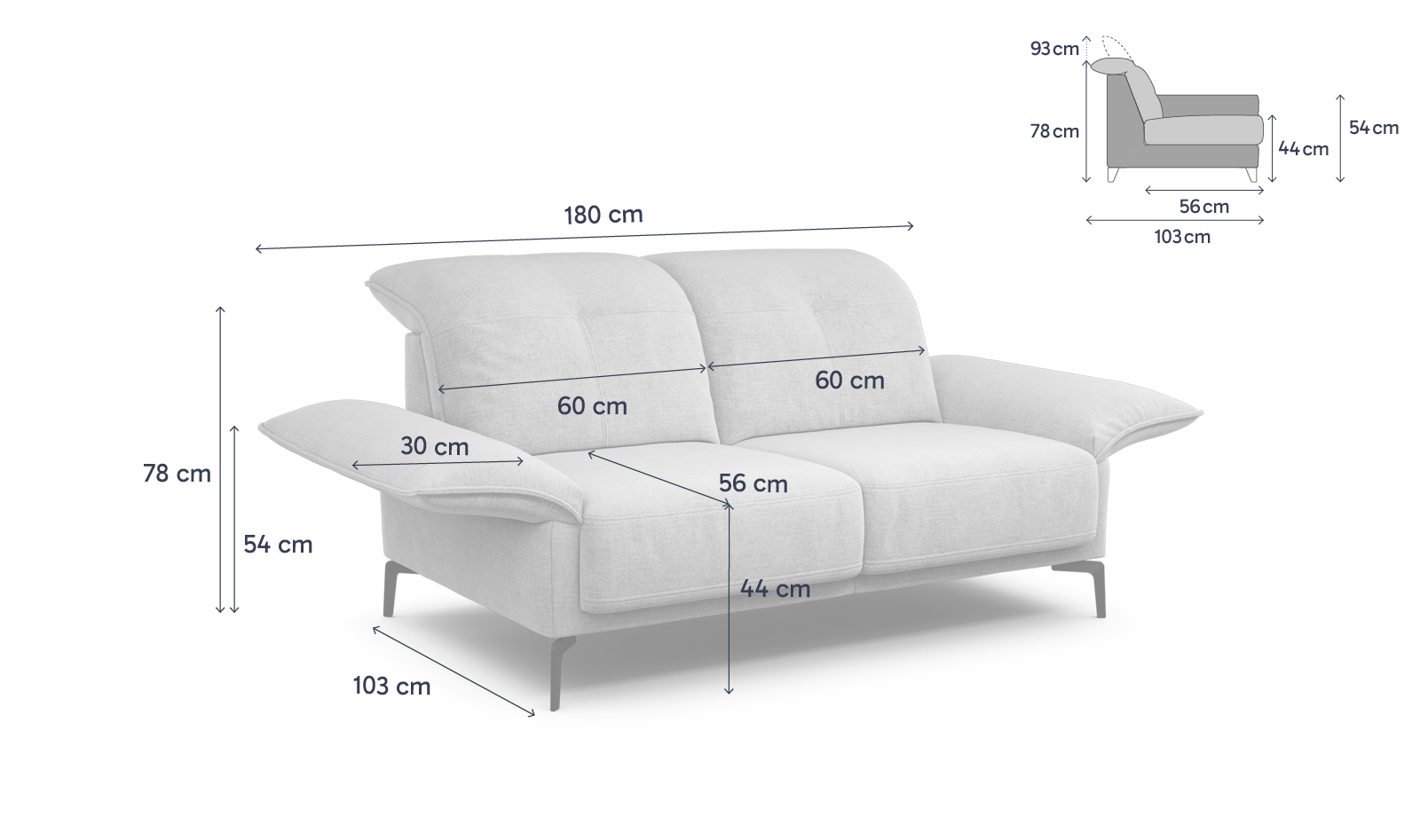 - Gesamtbreite (ausgeklappte Armlehne): 180 cm